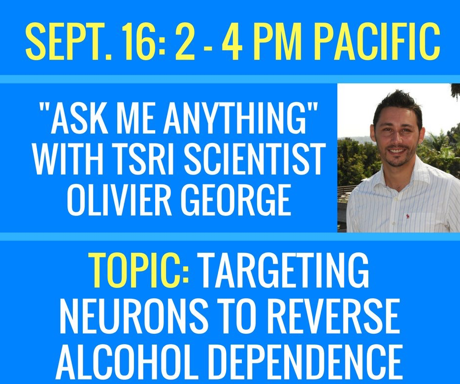 Ask Me Anything!Olivier GeorgeSep 16, 20161 min read Tune in to Reddit.com/r/science today 2-4PM (PST) for an "Ask Me Anything" session with Dr. Olivier George#reddit #alcoohol #dependence #neuron